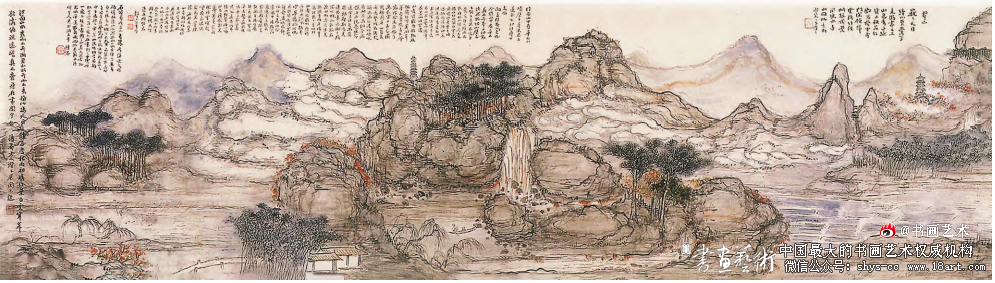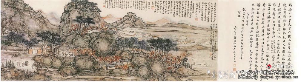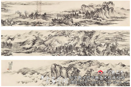李宝章《临安山色图》画心部分纵39.5厘米、横246.5厘米,引首有篆书大字题写的画题,卷中、卷尾有诸家题诗作跋,尽显鉴藏接递之风雅,总体规模虽比不上王翚的《临安山色》,但气象宏达,别有一番境界。