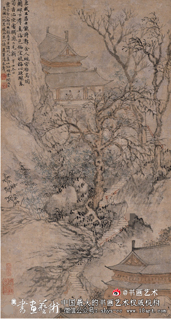 烟云阁图 作者:潘恭寿 创作年代:1781 规格:58.5×31.5cm 材质:纸本水墨设色潘恭寿(1741-1794),字慎夫,号莲巢,丹徒人(今江苏镇江),善画山水、人物、花卉、竹石,尤擅临摹古迹,与张夕奄、顾鹤庆等并称为“丹徒派”,著有《丘仙境舍集》。此图名为《烟云阁》,实乃纪述一...