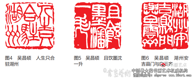 在篆刻中,吴昌硕通过冲、切刀结合,将书法的笔墨意趣应用于用刀中,使其篆刻线条浑厚古朴、劲猛爽利,将字在纸上的笔墨意趣表现在石头上,气息更显古朴自然。吴昌硕的《湖州安吉县门与白云齐》整个印面文字厚重质实,布局虚实相生,气息流畅,实处重拙,虚处空灵,虚实之间的辩证关系处理得恰如其分。