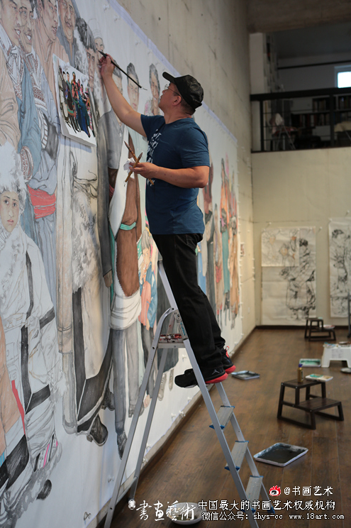 当我接受中国文联与中国美协委托,代表中央美术学院,为迎接党的十九大绘制巨幅中国画,描绘中宣部表彰的先进个人——尕布龙的任务时,还没能从刚刚完成北京市重大题材《午门誓师》的疲惫中走出来。新任务作品尺幅略小于上一张,但也有三米高八米长,作为中国画称得上是鸿篇巨制了,这么大的画幅在极短的时间内,画指定的内容并给予充分体现,是个难度很大的任务。