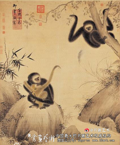 明宣宗朱瞻基(1399-1435),雅尚词翰绘事,书画之作随意自然,往往与宋徽宗争胜。宣宗尤喜画猿,有精湛的艺术功力。 《戏猿图》,纸本,设色,纵162.3厘米、横127.7厘米。此画生动地描绘了猿的三口之家:母猿爱怜地抱幼猿在怀,调皮的幼猿左手搂着母亲的脖子、右臂伸向父亲;而雄猿正攀援在隔溪的树上,摘了一串果子,引逗小猿。图上三猿不仅体态各异,神...